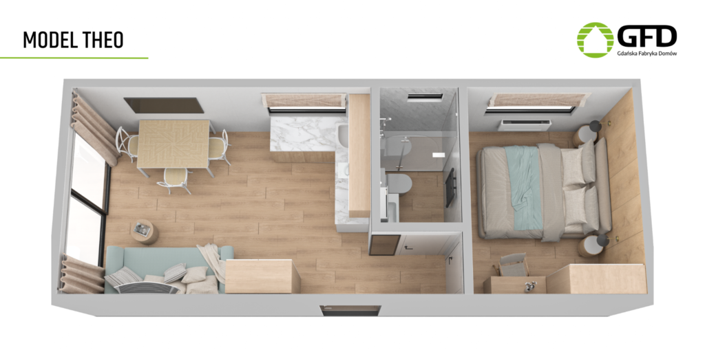 Domek mobilny ENERGY to rozbudowana wersja modelu STARTER – z pełną instalacją fotowoltaiczną, która zapewnia niezależność energetyczną i realne oszczędności. To idealne rozwiązanie dla osób, które chcą mieszkać wygodnie, ekologicznie i bez dodatkowych rachunków, ciesząc się pełną swobodą życia na własnych warunkach.